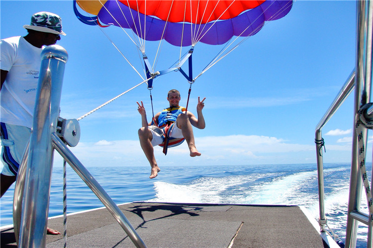 黄金海岸水上动感双人组合——听着快艇的发动机在耳边轰鸣。在某一个瞬间,快艇突然往前快速冲出,加速度带起来的风阻会让滑翔伞一下就飞起来,分外紧张刺激